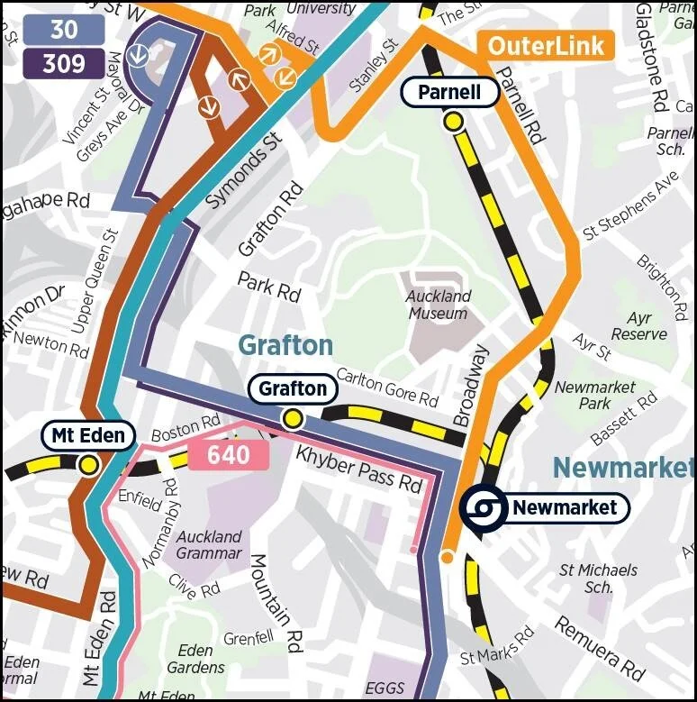 • Removing the section of the OuterLink route between St Lukes and Newmarket via Balmoral/Mt Eden where there is duplication with other bus routes to allow better reliability of the remaining section of the route from Newmarket to the city centre and on to suburbs in the west.